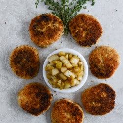 • Once the risotto is cooked, let it cool completely. You can do this the night before or a day ahead of time. Add the risotto to a bowl, cover it with plastic wrap and place it in the fridge until it’s chilled. When you’re ready to make the cakes, stir the flour into the risotto. Crumble the goat cheese into the mixture and stir until it’s evenly combined. If needed, add a little more flour until the mixture is just moldable.