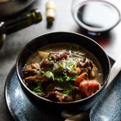And yeah, I’m thinking that you probably can make this in the crockpot, but I’d still be sure to brown the ribs first. And don’t add the potatoes, carrots and slurry until an hour or two before serving? Oh and you may need to cut down on the wine a bit. But really. Sometimes there is just something about simmering a pot of soup on the stove all day. Besides the whole having to be worried that you might forget about it and burn your house down.