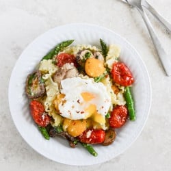 So we have: pretty little tomatoes that are shoved in the oven until they almost burst, but don’t. Garlic sautéed mushrooms and crisp asaparagus and noodles swirled in olive oil, fresh herbs and freshly grated cheese. And topped off with the softest poached eggs peppered with crushed red pepper.