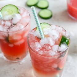 - To assemble the drinks, add crushed ice in a cup. Pour a few ounces of the vanilla ginger syrup into the cup, then add 4 or so ounces of watermelon juice. Pop the cucumbers in the cub and add about 2 ounces of club soda. Taste and adjust the drink to your desired taste – more syrup or juice, or more club soda. Stir well to mix. Serve!