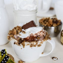 - for chocolate chip cookies and cream hot chocolate: before filling your mug, rub frosting (from the tub is fine!) or honey (you need a sticky substance) along the rim of the mug. Crush 2 chocolate chips cookies into crumbs and press the crumbs into the sticky rim. Fill the mug with hot chocolate, then top it with whipped cream, marshmallows, a big cookie and a cookies and cream HELLO chocolate.