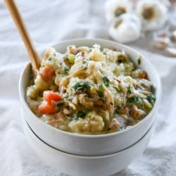 - Top the entire pot with fresh chopped parsley. This is a very dumpling heavy recipe, which I adore. Serve immediately! I love how this reheats – just add a bit of stock or milk when reheating!