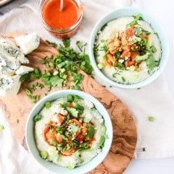 That has to be the prettiest bowl of grits I ever did see! Love this idea. Obsessed with all things buffalo and bleu, so this will be making an appearance in my kitchen very soon.