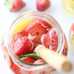 I added a few extras into my pineapple sangria —> strawberries! Super fresh and ripe. Cut ’em, slice ’em, leave ’em whole. It’s up to you. Also, fresh mint. Not enough fresh mint to make it a toothpaste sangria, but enough to give it a little fresh, crisp flavor. Limes, because they are pretty and I’m all #omgcitrus at the moment.