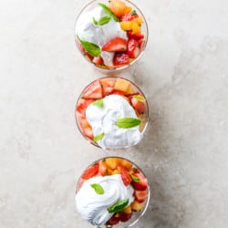 - Pour about half of the syrup into the fruit and stir well. Taste and add more if desired – the fruit will be juicer at this point too. I like to chop a little more mint and throw it in. To serve, spoon into bowls then place a dollop of the marshmallow frosting on top. You can drizzle more bourbon syrup on and add a few mint leaves. Enjoy!