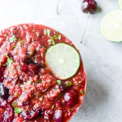 • Add the can of tomatoes, the onions, peppers, garlic, lime juice and almost all of the cherries (I like to save a few to add whole cherries on top – you don’t need to do this!) to a food processor. Pulse until you have the consistency of salsa you enjoy. I like this particular one to be restaurant style-like! Stir in the chopped cilantro. Taste and season with salt and pepper if desired. Serve and garnish with extra lime if you’d like. This can be stored in the fridge in a sealed container and stay fresh for a few days!