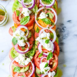 - Add on the sliced red onion – as much or little as you’d like. I drizzle about half the herb dressing on now, then cover the top with pulled burrata. Drizzle the rest of the herb dressing on. Cover with the fresh basil and oregano leaves. A sprinkle more of salt and pepper if you’d like – and serve!