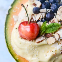 - Equally split the smoothies between the cantaloupe bowls. Top each with 1/3 cup blueberries, 2 tablespoons toasted almonds, 2 tablespoons coconut and 1 tablespoon hemp seeds. Add anything else you may love! I recommend eating it with a grapefruit spoon and going for chunks of the cantaloupe first so the smoothie can sink further down into the ‘bowl” as opposed to over the edges. YES.
