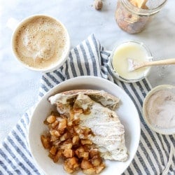 I used Sarah’s vanilla bean dutch baby base, only adding cinnamon for that cinnamon roll touch. Since it’s autumn here now, I made an apple bourbon compote instead of a cherry bourbon one and drenched the entire thing in a drizzle of cream cheese icing.