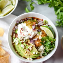 - for topping: queso fresco, sour cream or greek yogurt, green onions, diced red onion, fresh cilantro, crushed red pepper, avocado slices, lime wedges, tortilla strips or chips