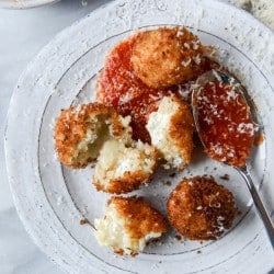 I know you’re probably dying to ask if these can be baked (no, no? just me?) and not fried. The answer is yes, but they won’t be exactly the same. The exterior won’t be as crisp, which is one of the best parts. You take a bite and it crunches just a teeny but, right down into a love filled hug of warm risotto and a center of melty cheese.