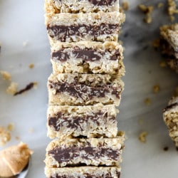 - Press half of the oat mixture into the baking dish. Pour the melted chocolate over top, spreading with a spatula. Gently press the remaining oat mixture over top. Let cool completely or refrigerate (I love these cold!) – let sit for a few hours (3 to 3) before slicing.