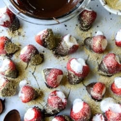 • Gently dip the bottom half of each strawberry into the chocolate, placing it back on the parchment paper. Sprinkle the chocolate with graham crumbs. You can stick these in the fridge for a little before serving. You can also use store bought marshmallow fluff, but it might melt easier. If you make them ahead of time, they must stay in the fridge and the marshmallow may run a bit!