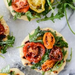 Also, yes yes yes to everything in this recipe. Arugula is one of my favorite leafy greens. Charred tomato, garlicky butter, oh thay crispy dough. Winner of the Genius Mini Pizza Award.