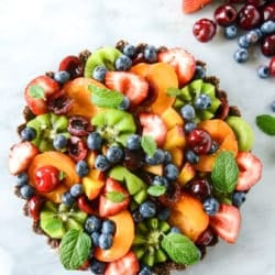 No-Bake Chocolate Cashew Coconut Crusted Summer Fruit Tart.