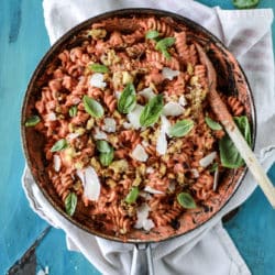 When tomato sauce is swirled with cream, or in this case, OMG mascarpone cheese!, I could easily consume it weekly. Maybe daily. The mascarpone cheese is so rich and cuts the acidity. It makes it so much creamier than actual cream does! It’s comfort food. Topped with more comfort food.
