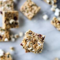 • In a large pot, add the butter over medium heat. Whisk constantly until the butter begins to brown – the moment you see brown bits, reduce the heat to low and whisk in the toasted marshmallows. Stir in the cashew butter. Once the mixture has completely melted, fold in the brown rice krispies. After a few stirs, stir in the toasted quinoa, pepitas and cranberries.