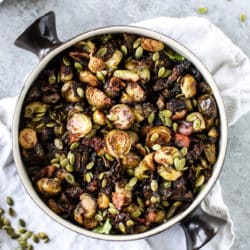 I like to roast my brussels within an inch of their life. Lots of char and caramelization and lots of crispy bacon. Maybe so it masks the actual flavor, who knows. Tangy and salty with a little sweetness. And then! You can top the entire thing off with roasted pepitas if you wish.