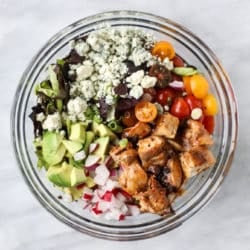 - Assemble the salad by combining the lettuce with a pinch of salt and pepper, tomatoes, radishes, onion, blue cheese, green onions and chicken. Drizzle with the dressing, toss and serve!