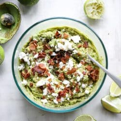 This guac is spicy and smoky, filled with crunchy bacon and creamy cheese, but also some of the regular old guacamole flavors that we love: lime, sweet onion and cilantro. I just want to dive in there with a big old spoon.