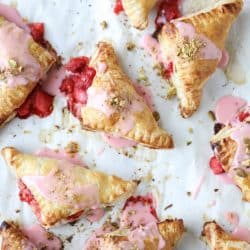 • After 5 to 10 minutes, drizzle the turnovers with the strawberry glaze. Sprinkle the chopped pistachios on top. Serve immediately!
