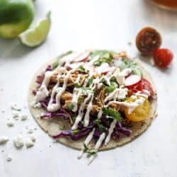 This flavor is unreeeeeeal. Oh my gosh. The chicken is so tender and juicy. The lime cabbage is crunchy. The avocado is perfect because what else is avocado if not perfect. Tomatoes, quick pickled radishes, some cilantro and a creamy chipotle drizzle for some richness. Lots of lime spritzes! Whatever tortillas you favor, be it corn or flour.