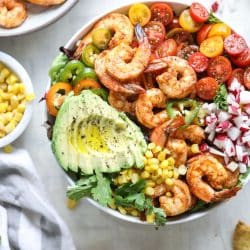 - To assemble the salad, fill the bowl with the greens. Top with the shrimp, radish, tomatoes, peppers, avocado, corn and cilantro. Season with salt and pepper. Drizzle with the dressing and serve!