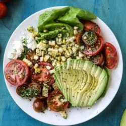 Also known as, one of my most favorite things ever. Give me all the grilled corn, tomato and avocado and drench it in a good shower of chimichurri. I am ONE happy camper. Lots of herbs too. Some cheese for good measure.