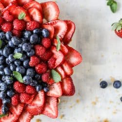 - To make the berry star, form the blueberries into a star in the center of the tart. It doesn’t have to be neat, just get the shape and you can fix it later! Layer the strawberries along the outsides of the tart, making two or three rows. Fill in the center spaces with raspberries. Go back in and “perfect” the star as much as you can. Right before serving, drizzle with honey and top with fresh mint.