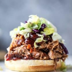 I used some fresh brioche buns from my local grocery store and geez, were they awesome. So delicious. So buttery. So soft. Any buns work! Most times I like to serve the pork as sliders too.