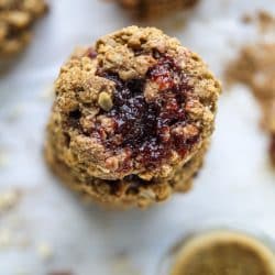 So here’s what I did. I took my blueberry breakfast cookies (which you guys all really love!) and wanted to make them a bit more chewy and less cakey. And obviously wanted to add peanut butter AND jelly. I didn’t want the jelly mixed in so you could barely detect it. I wanted it to be legit jelly.