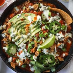 - When it comes time to serve, serve in bowls with toppings of extra wing sauce, grated cheddar cheese, crumbled blue cheese, green onions, chives, avocado and lime wedges!