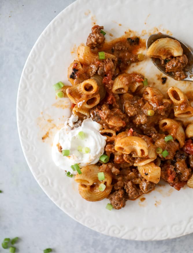 I started making a version of this while pregnant – Amy’s easy chili mac. Before that, I probably wouldn’t have even been interested in a recipe like this. Pregnancy does weird things to you. And it was so good… but I realized that I could do without the beans AND pasta (even though I do love beans in chili) and then eventually, wondered if everything could be made in ONE pot.