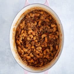 • Once the beef is browned, stir in the tomato paste, chili powder, paprika and cumin. Cook for another 5 minutes, stirring often. Pour in the tomatoes, green chiles and stock (or water). Add in the pasta. Bring the mixture to a simmer, then cover the pot and cook for 10 to 15 minutes, stirring occasionally. The pasta should absorb all the liquid and plump up! You don't want the heat too high, because the pasta can stick on the bottom. If it needs a few more minutes, keep the pot covered.