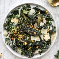 • Drizzle a few tablespoons of the dressing over the kale and toss it well. I like to toss this for a food 1 to 2 minutes so the dressing is evenly dispersed. Cover with the chopped pistachios and shaved parmesan. Serve!