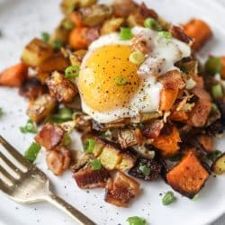 Back in 2015, about four months after I had Max, I did whole 30 and a version of this was one of my go-to breakfasts. I loved it so much (just not after eating it everyday straight for two weeks, ugh) and would make it in a skillet – the potatoes, bacon, eggs on top – everything. Or I’d even scramble eggs right into it. Eating sweet potatoes like this is exactly how I want them. I’m never going to be the person who slices open a baked sweet potato for dinner and eats it plain as a side to chicken or fish. I think that is super boring and not flavorful.