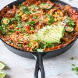 This enchilada skillet includes pinto beans and corn, homemade sauce (the best!), scallions, avocado, jalapeños and small flour tortillas. I love to use flour tortillas here because they hold up well in the oven – and especially when reheating!