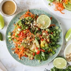 - On a plate (or 2 plates!), combine and/or layer the avocados, carrots, green onions, mango, red bell pepper and jalapeño. Drizzle on the peanut butter vinaigrette. Top with the cilantro, peanuts and sesame seeds.