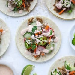 These banh mi tacos are the perfect twist on the classic sandwich! Juicy pulled pork, pickled veggies, a tangy crema and loads of flavor. Banh mi tacos are a delish weeknight meal or also work great if you have pork leftovers!