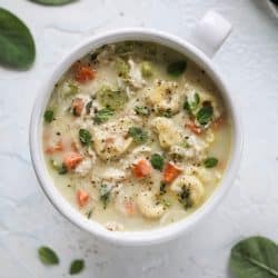 I love regular old chicken noodle soup but a creamy version occasionally draws me in. And in this case, a creamy tortellini version. Instead of your egg noodle, we’re making things more fun.