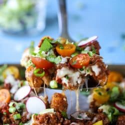 I’ve had this recipe waiting in the wings for you since April. APRIL! I started making this in April for some get-togethers and it was such an instant hit. People were freaking over the tater tots. I know that totchos aren’t a new concept but in our house? It totally was.