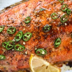 • Before serving, drizzle a bit more honey on the salmon and add the peppers if you wish. Serve with an extra spritz of lemon.