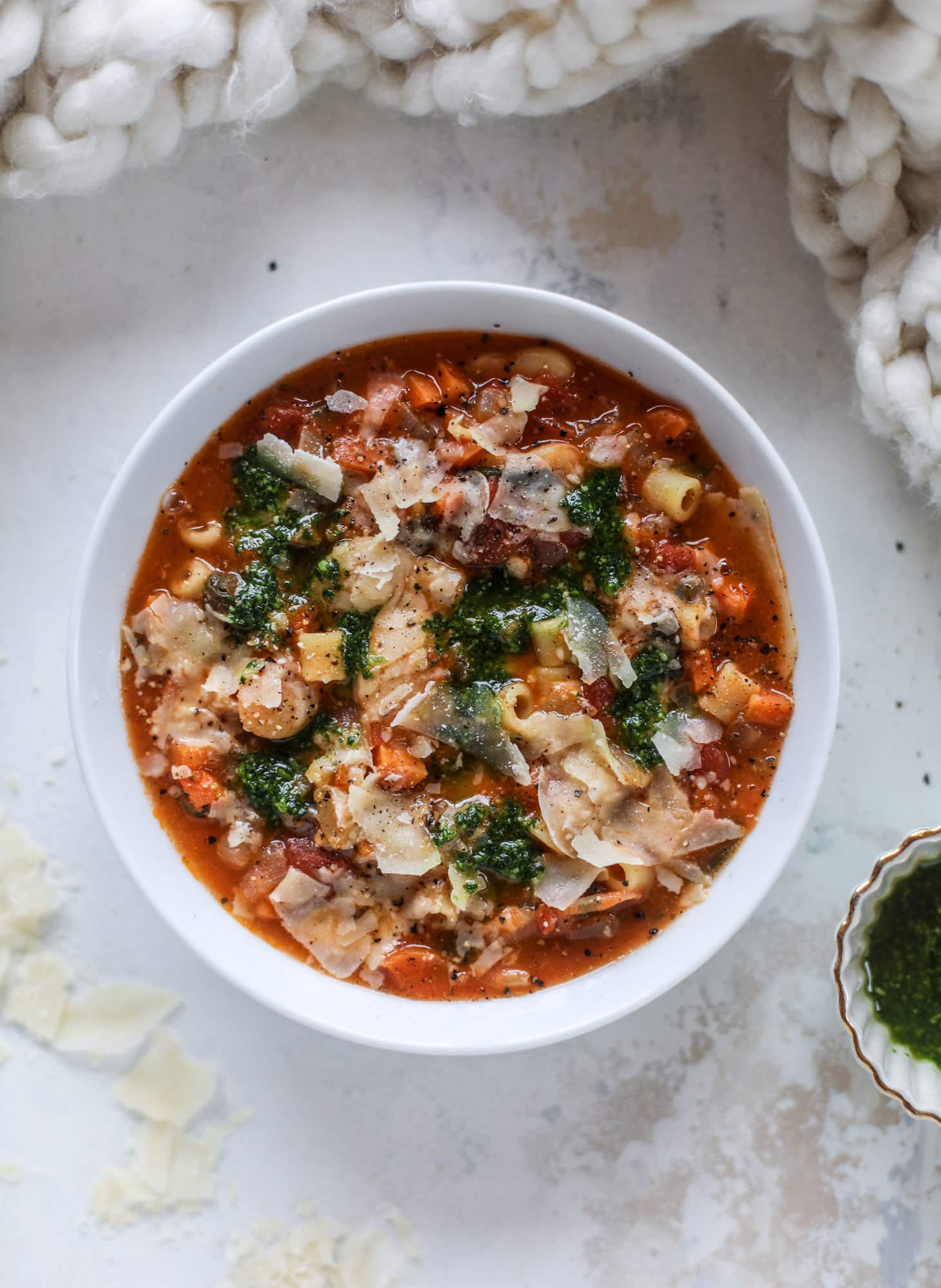 My last requirement for minestrone is a bunch of freshly shaved parm grated right on top. Of course, I throw a parmesan rind in when I have one. But having it on top add this delicious sharp flavor that adds so much. It also adds a touch of richness.
