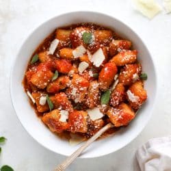 • Once the gnocchi are cooked, serve them however you'd like. Here, I used marinara sauce, fresh herbs and shaved parmesan. Super simple and delicious!