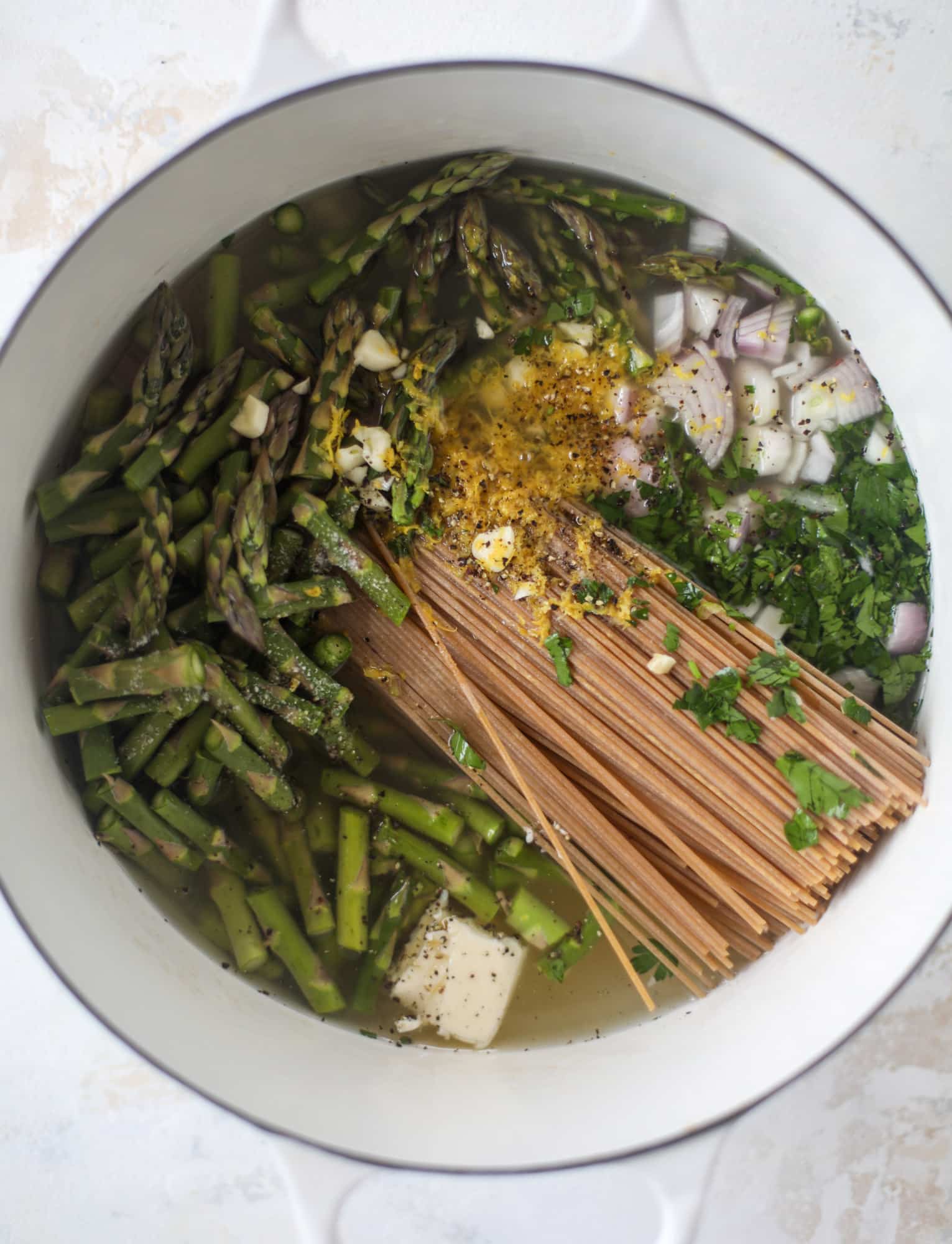 • Place the asparagus, pasta, garlic, shallot, lemon juice and zest, water, stock, parsley, butter, salt and pepper in a large stock pot. Bring the mixture to a boil and cook for 10 to 12 minutes, stirring occasionally to make sure the pasta doesn’t stick to the bottom of the pot.