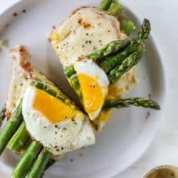 Since I’m freakishly into asparagus right now, especially when it’s roasted, I couldn’t NOT put asparagus on this croque madame. I love the combo of asparagus and eggs so much. It was a natural fit. Plus, I’m always trying to get more veggies into everyday life.
