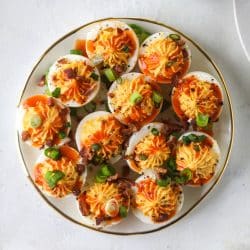 • Scoop out the mixture and spoon it (or pipe it with a pastry bag) into the open egg whites. Drizzle the eggs with more buffalo wing sauce (as much as you’d like!) and sprinkle with the fried bacon. Top with sliced green onions. Sprinkle with freshly cracked black pepper or smoked paprika.