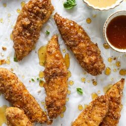 Pretzel Crusted Chicken Fingers with Hot Honey