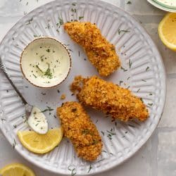 While this is such a retro throwback type of meal, you can totally make it however you’d like. Serve it with some parmesan roasted broccoli or smashed potatoes. That flavor profile is comforting and classic. Or skip the tartar and do ketchup or BBQ sauce if you must. Add some chili and lime to the breading instead of lemon. Make an open face sandwich with slaw. Cover it in hot sauce! Put it in a taco!