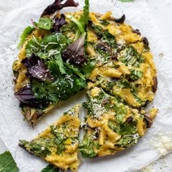 • While the frittata bakes, whisk together the olive oil and lemon juice with a pinch of salt and pepper. Toss the greens with the olive oil + lemon juice and toss.